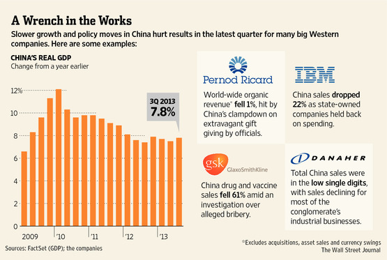Just as European economies are showing signs of stabilizing and the U.S. economy is waking up, some companies are running into obstacles in a market long considered their brightest hope: China. U.S. and European companies invested heavily in recent years to expand in China, seeking to tap into its flourishing middle class and fast economic growth. Since the global recession, China has helped offset the free fall in sales and profits in the euro zone and stagnant revenue in the U.S.But the latest set of quarterly earnings results reveal that for many companies, China has been a drag. While some industries did well, the combination of slower economic growth, plus government crackdowns that have put fresh scrutiny on the way companies win new business, hurt sectors from technology to luxury goods to pharmaceuticals. As a result, the sluggish global sales that persisted through much of the recovery aren’t likely to pick up soon.