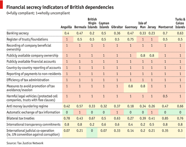 In September David Cameron, the British prime minister, told the House of Commons that: “I do not think it is fair any longer to refer to any of [Britain’s] overseas territories or crown dependencies as tax havens. They have taken action to ensure that they have fair and open tax systems.” As the table above shows, Mr Cameron’s comments may be somewhat premature: the British-linked jurisdictions all continue to score badly on the majority of the indicators tracked by the TJN. (Those jurisdictions argue that the index’s compilers don’t make a clear enough distinction between legitimate client confidentiality and crime-concealing secrecy.)