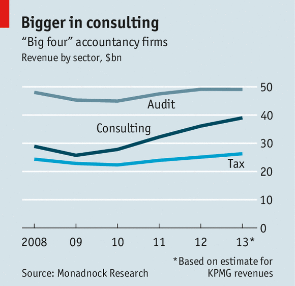Just as the workload from Sarbanes-Oxley began to dwindle, the 2008-09 financial crisis hit, causing consulting revenues to dip (see chart). But once the economy recovered, the climate for the Big Four started to resemble the 1990s. They began to rush back into consultancy, encouraged by its high margins and double-digit annual growth rates at a time when revenue growth from auditing and tax work had slowed. In particular, Deloitte and PwC began gobbling up operations consultancies as they sparred for the top spot.