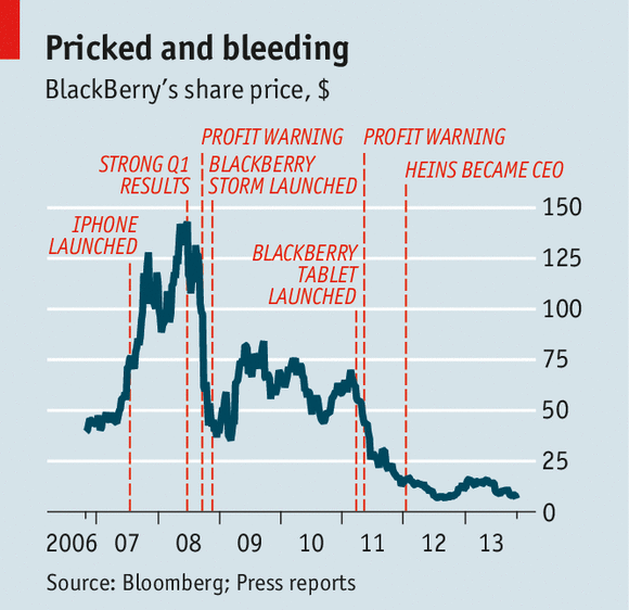THE signs do not look good. On November 4th, six weeks after BlackBerry said that its biggest shareholder, Fairfax Financial, wanted to take the ailing Canadian smartphone-maker private for $4.7 billion in cash, the sale was called off. BlackBerry instead declared that it would raise $1 billion in debt, convertible into 16% of its shares. Fairfax, a Toronto holding company that focuses on insurance but owns 10% of BlackBerry, is taking a quarter of the issue. Barbara Stymiest, who chairs BlackBerry’s board, called this “a significant vote of confidence in BlackBerry and its future”. The stockmarket called it a flop: the share price, already a fraction of what it once was (see chart), fell by 16%.Thus BlackBerry ended a “review of strategic alternatives” with no visible alternative strategy—and no chief executive. Thorsten Heins, its boss since January 2012, was unseated. He brought a much-delayed operating system, BlackBerry 10, to market, but this will not make much difference. Although lots of people still carry BlackBerrys, not many of those devices are new. BlackBerrys have not only been squished by Apple’s iPhone (and iPad, to which BlackBerry responded feebly) and by Android devices; they are also being outsold by phones with Microsoft’s Windows. In its latest quarter BlackBerry lost $965m, mostly because of a write-down of unsold phones. Last month it made its BBM instant-message service available as an iPhone and Android app.