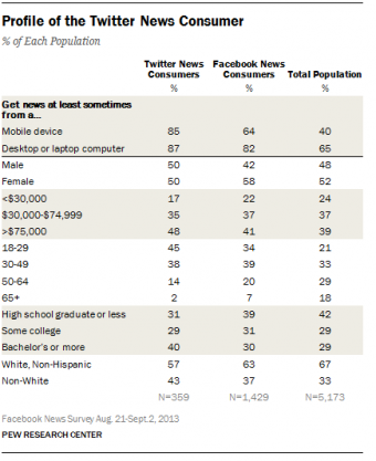 Nearly one-in-ten U.S. adults (8%) get news through Twitter, according to a new report by the Pew Research Center, in collaboration with the John S. and James L. Knight Foundation. Compared with the 30% of Americans who get news on Facebook, Twitter news consumers stand out as younger, more mobile and more educated.
