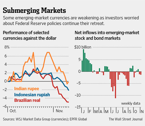 Even before the jobs data, investors had started to pull funds out of emerging markets. Emerging-market fund managers yanked $1.32 billion out of stock and bond markets in the week ended Nov. 6, according to data provider EPFR Global. That compares with weekly inflows of $2.44 billion as recently as late September.