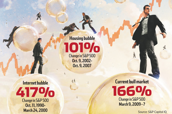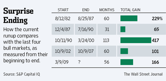 So far, the rise that started on March 9, 2009, has lasted 56 months and produced gains of 166%. Of the 16 other bull markets since 1921, six have been longer and five have risen more.