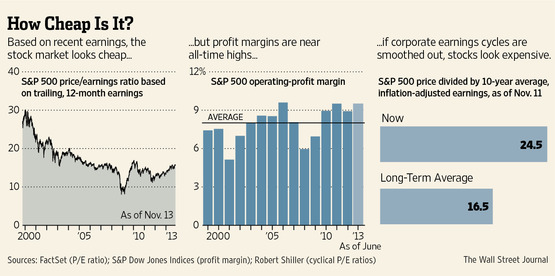 By that measure, the S&P 500 has a price/earnings ratio of about 24.5, some 48% higher than the 16.5 average for U.S. stocks since 1881.