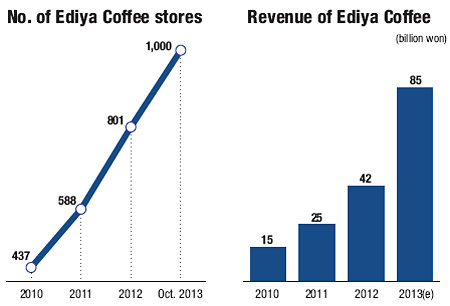 In 2010, the number of Ediya shops stood at 437 but jumped to 588 in 2011 and 801 in 2012. The company revenues, accordingly, surged at an average annual rate of 72 percent from 2010 through 2013. Ediya estimates its sales will reach 85 billion won this year, up from 42 billion won in 2012, 25 billion won in 2011 and 15 billion won in 2010.