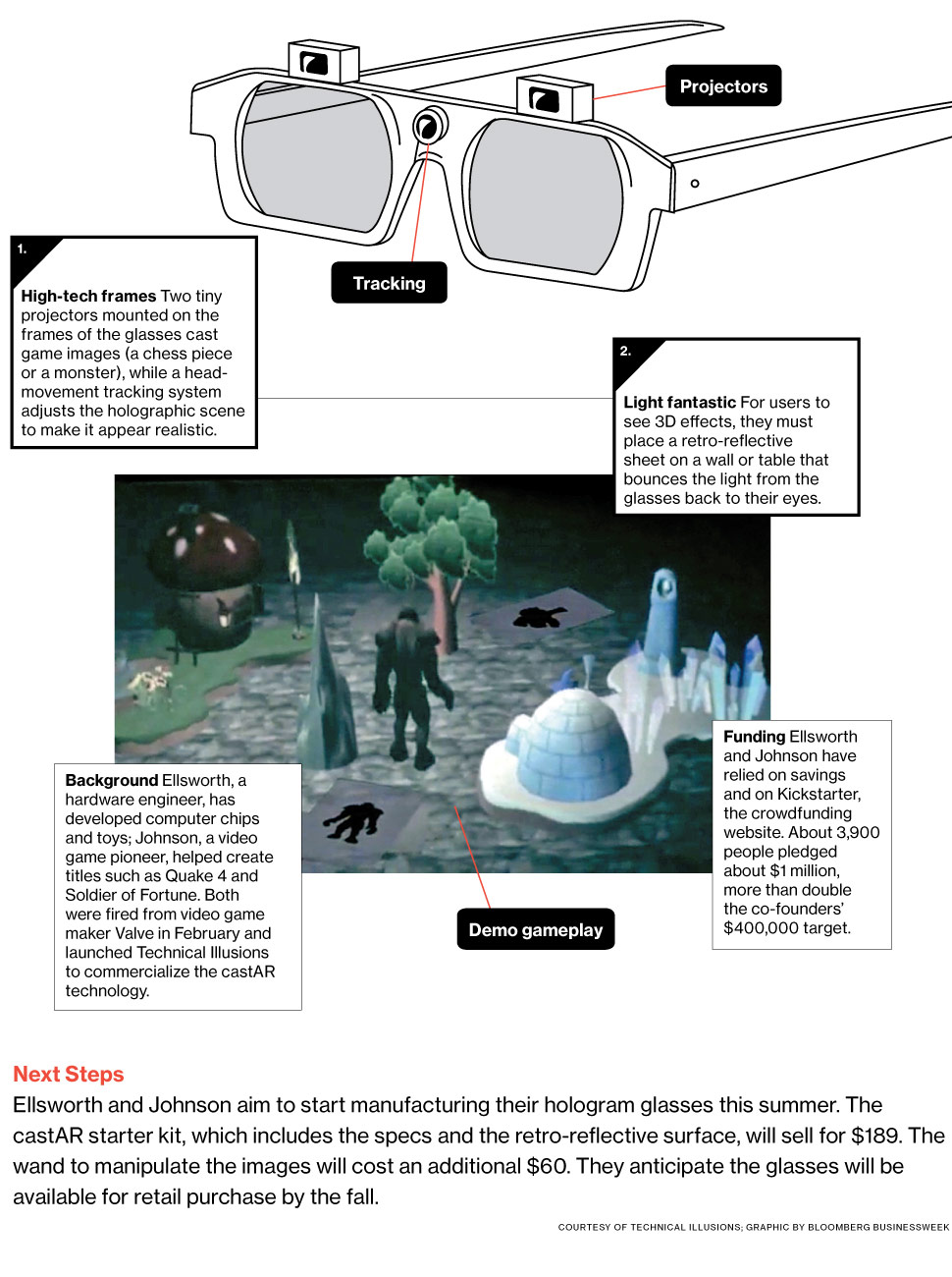 Form and function: Technical Illusions has developed castAR, a pair of high-tech glasses that project 3D hologramlike images, and a “magic wand” that can be used to interact with the holographic projections to enliven gaming and teaching.