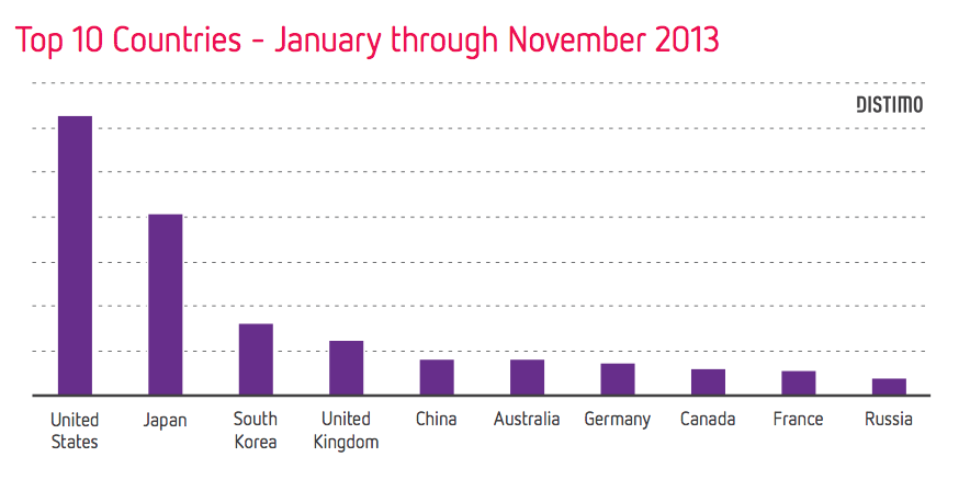 The aggregated revenue of the Apple App Store increased by 12 percent over the last six months, whereas Google Play’s revenue grew by 51 percent when comparing the revenue at the end of June and November 2013 respectively.