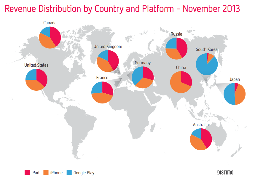 On a typical day in November 2013, we estimate the global revenues for the top 200 grossing apps in the Apple App Store at over $18M. For Google Play, our estimate is about $12M. In November 2012, these estimates were at $15M for the Apple App Store and only at $3.5M for Google Play.