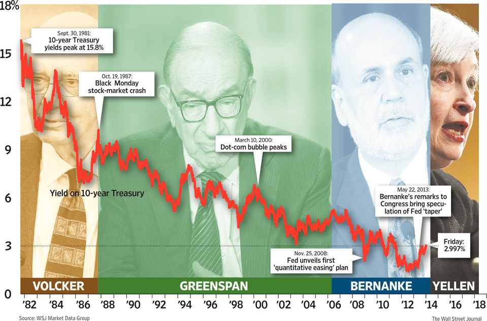 Interest rates have been heading steadily down for more than three decades, but last year the rate on the benchmark 10-year Treasury climbed 1.27 percentage points to 3.03%, ending a three-year streak of declines and prompting investors such as Pacific Investment Management Co.’s Bill Gross to predict that the long bull market for bonds has ended. The rise in rates stuck investors in funds that track the Barclays U.S. Aggregate Bond Index with their first loss since 1999—albeit one of only 2%.
