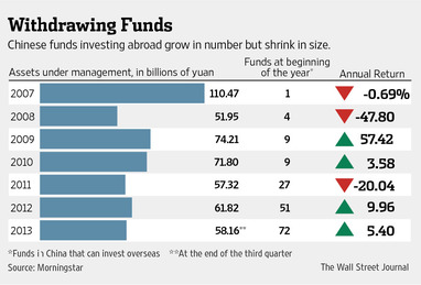 Chinese investors are shying away from overseas markets in favor of domestic assets, even though many funds invested abroad delivered double-digit returns last year.Eager to invest abroad, Chinese investors had flocked to funds that focused on global assets ranging from commodities to stocks shortly after China launched its Qualified Domestic Institutional Investor program in 2006 as part of a gradual effort to open its capital accounts. But these funds have been shrinking in size, and the total assets under management have tumbled by almost 50% from the peak in 2007, according to research firm Morningstar.