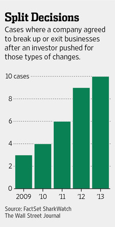 Aggressive investors including Elliott Management and Barington Capital Group LP were a driving force behind a number of deals at big companies in 2013. According to FactSet SharkWatch, there were 10 instances in 2013 in which a U.S. company agreed to break itself up or sell or exit businesses after an investor pushed it to make such changes, even if the moves didn’t always satisfy the activist.