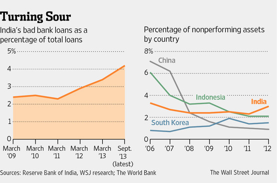 As a percentage of total loans, nonperforming assets at Indian banks climbed to 4.2% in September, up from 2.4% in 2009, according to the latest data available from India’s central bank. Analysts expect the ratio to rise as high as 5.7% in the next four months.