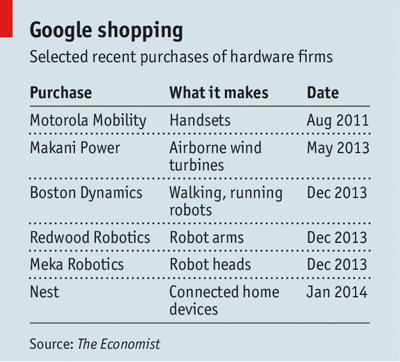 AT GOOGLE they call it the toothbrush test. Shortly after returning to being the firm’s chief executive in 2011, Larry Page said he wanted it to develop more services that everyone would use at least twice a day, like a toothbrush. Its search engine and its Android operating system for mobile devices pass that test. Now, with a string of recent acquisitions, Google seems to be planning to become as big in hardware as it is in software, developing “toothbrush” products in a variety of areas from robots to cars to domestic-heating controls. Read more of this post