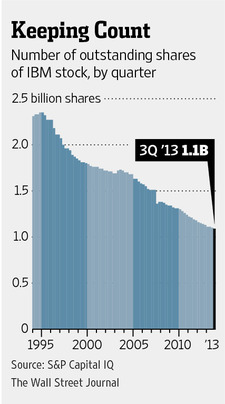 For the past 20 years, IBM has been an avid, methodical buyer of its own stock. In 1993, it had 2.3 billion shares outstanding. Today it has 1.1 billion, shrinking at more than 1% per quarter over the past few years. At that pace, there will be no more publicly traded IBM shares left by 2034.Rejoice! You might regard all this buying as good news for shareholders. Buybacks push up earnings per share. They flaunt management’s confidence in the future. And they are a reason why retail investors have held on so lovingly to IBM stock.
