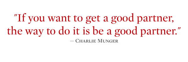 Partnerships also encourage humility. “It’s not letting ego or jealousy or your own personality take over,” Munger says. “Intelligence takes over.”
