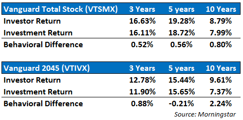 You can see both have positive behavioral differences and the 2045 Fund has an amazing 2%+ outperformance by investors versus the fund returns.