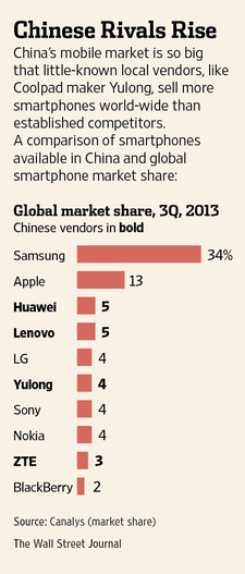 China’s mobile market is so big that some local handset vendors, despite focusing mainly on the domestic market, already sell more smartphones overall than global competitors. In the third quarter of last year, Coolpad, the smartphone brand of China’s Yulong Computer Telecommunication Scientific (Shenzhen) Co., was the sixth-biggest smartphone vendor by units sold world-wide, ahead of Nokia Corp. and Sony Corp. 6758.TO +1.50% , according to Canalys.