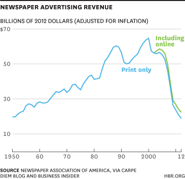 When the industry tipped, it did so with a fury. A beautiful (yet scary) graph from University of Michigan economics professor Mark Perry shows how 60 years of growth was wiped out in three. There is still money to be made in what remains of the newspaper industry, but the past few years have seen dramatic retrenchment and downsizing.