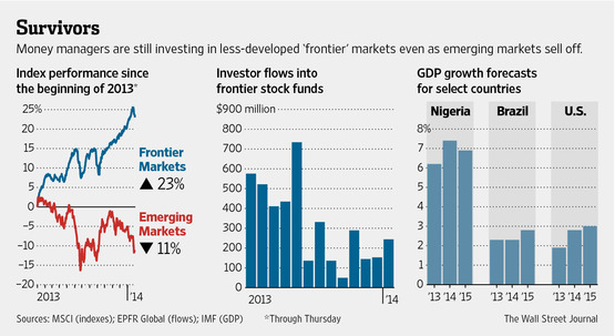 Because they are off the beaten path, frontier markets haven’t been swept up in the selloff that has pummeled emerging markets. Countries such as Nigeria, Pakistan and Bangladesh didn’t see much of the cash that poured into emerging markets after the financial crisis, when low-interest-rate policies in richer economies sent investors in search of better returns in the developing world.