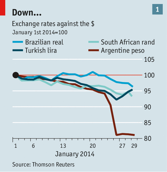 They did not have to look too hard. In recent months Argentina has squandered a big chunk of its foreign-exchange reserves in a doomed defence of the peso, which eventually fell by about 20%, despite the government’s fitful efforts to curtail capital outflows. On January 23rd a widely watched index of manufacturing in China fell by more than expected, raising the prospect of slowing growth amid excessive credit. In Turkey, the sons of three cabinet ministers were arrested in December in a corruption scandal. Meanwhile, in both icy Kiev and balmy Bangkok, protesters are on the streets.
