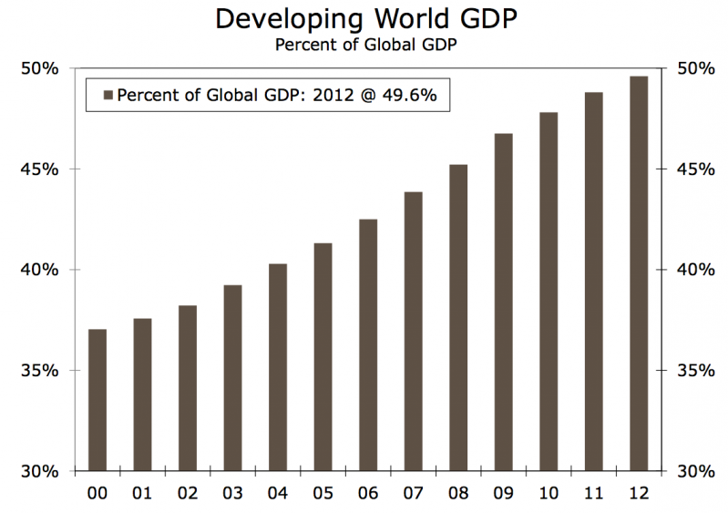First, the developing world’s share of global GDP has climbed from 37% in 2000 to 50% in 2012: