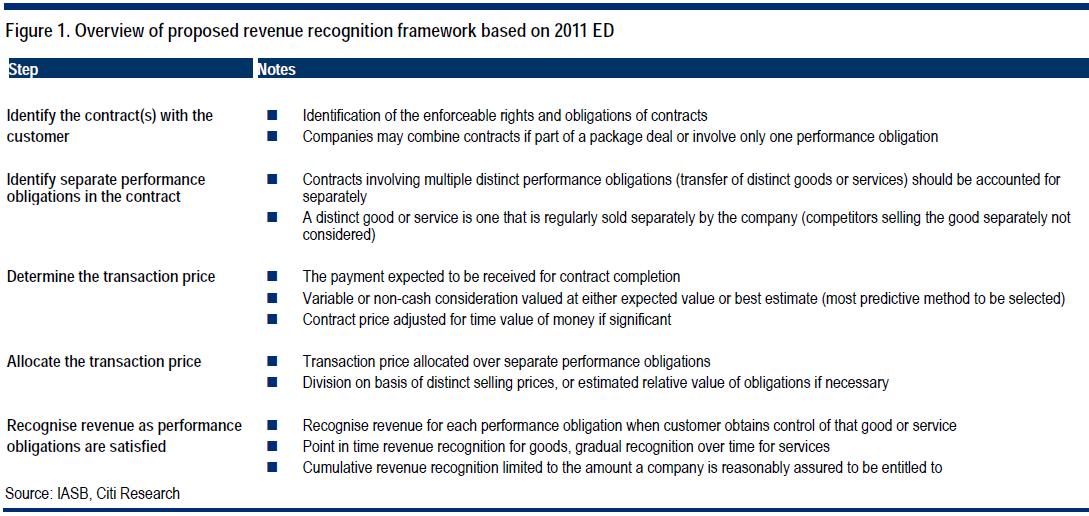 The Citi analysts point out that the International Accounting Standards Board (IASB) failed again in 2013 to deliver final standards for any of the four major projects it has been working on for several years. However, the analysts anticipate two important new IFRS standards to be published in 2014 viz.: revenue and financial instruments. The following table captures the overview of proposed revenue recognition framework: