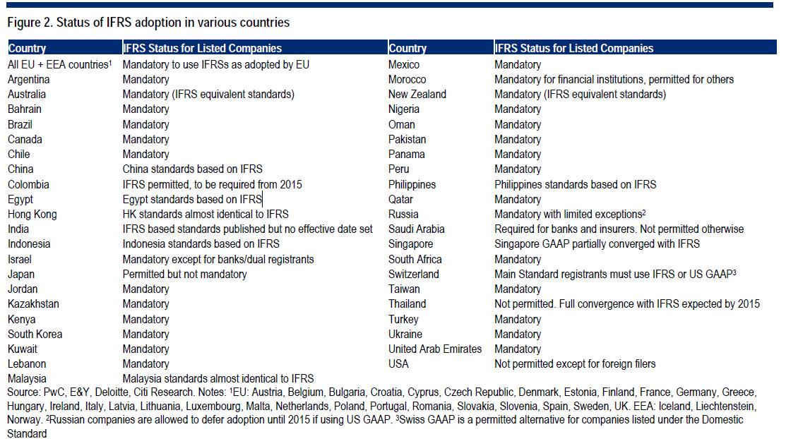 As reported earlier, in 2012, the Securities and Exchange Commission issued a report without making any recommendation or timeframe for adopting IFRS. The Citi analysts don’t expect the US to adopt IFRS in the foreseeable future. The following table summarizes the status of IFRS adoption in various countries: