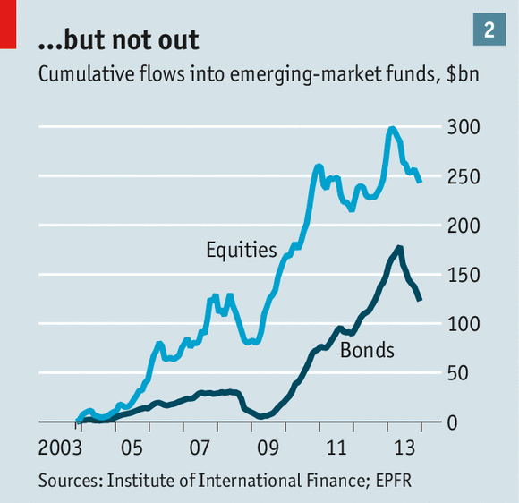 These local difficulties, not all of them little, are unfolding against the backdrop of a gradual rise in global interest rates, as America’s economy strengthens and the Fed moderates its bond purchases. Yields on ten-year Treasuries are still low: about 2.8%. But that is more than one percentage point higher than nine months ago. At Mr Bernanke’s last meeting as chairman, on January 29th, the Fed decided to cut its monthly purchases by another $10 billion, having done the same in December.