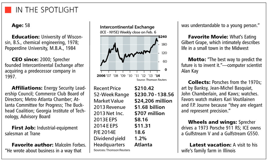 ICE has made Sprecher, who owns 1.7% of the company, a rich man who collects Porsches, watches, and art. Other shareholders also have profited handsomely, given the stock’s 500% advance since its initial public offering in November 2005. The shares were trading at $208 late last week, endowing the company with a market value of $24.2 billion.