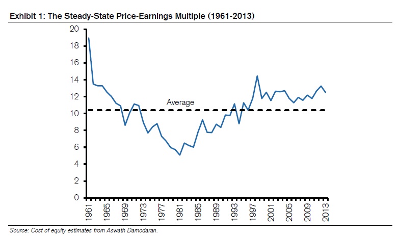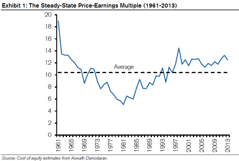 “As of the beginning of 2014, Aswath Damodaran, a professor of finance at New York University’s Stern School of Business, estimated the cost of equity in the United States to be 8 percent. This translates into a steady-state PE multiples of 12.5 times,” write Mauboussin and Callahan.