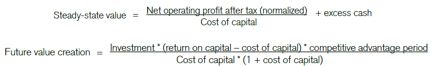 They argue that company valuations are best understood when broken down into two distinct pieces: steady-state value and future value creation. Steady-state value is fairly intuitive, measuring net profits against the cost capital, plus any cash lying around. Future value creation is more complicated. While most investors think in terms of growth, the concept can be misleading because there is a cost of capital. Growing with returns below the cost of capital actually destroy shareholder value.