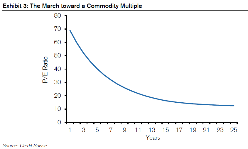 Understood this way, it also makes sense that most companies’ PE multiples will decline over time as the business matures and the stock price approaches its steady-state value, and while actual stocks are more complex than models, you can see how the decline in PE multiples for mature businesses trends toward what Mauboussin and Callahan call the commodity multiple.