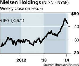 This week, Nielsen is expected to report that 2013 revenue rose 2%, to $5.7 billion, with net income up 7%, to $750 million, or $2 a share. Those numbers will keep growing as the global economy recovers and new initiatives become popular with customers. “As media becomes more fragmented, with more types, on more devices, the ability to measure consumption is of increasing importance. They are effectively the only game in town,” says Andrew Peck, manager of the Baron Asset fund (BARAX), which owns the shares. Peck reckons that Nielsen’s earnings will jump to $3.89 a share in 2017, nearly double the level of 2013. At a price/earnings ratio of 16, which is the S&P 500’s median historical level and a lower multiple than they now fetch, the shares would be worth $62.
