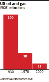 Shale gas/oil and fracking are just an extension of this trend. US oil production had an Eroei of 100:1 in the 1930s – every hundred units produced required one unit to be expended. By 2000, despite huge technological advances, that had dropped to 11:1. The ratio for shale oil is about 5:1. This is a critical difference.