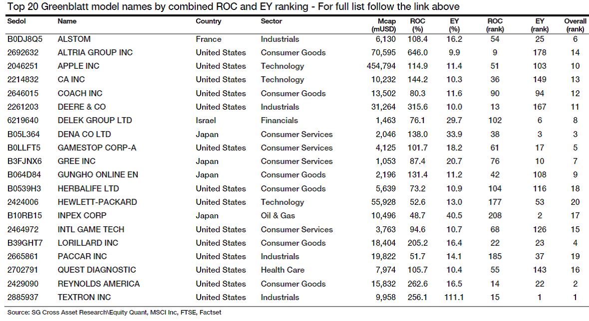 Here ais SocGen’s list of companies appearing on the Graham & Rea and the Greenblatt Magic Formula screens: