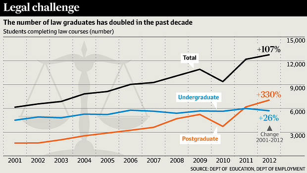 The number of bachelor’s graduates in law increased by a more modest 26 per cent during the same period, from 4514 in 2001 to 5706 in 2012. Combined, this has meant a jump of students graduating with some form of undergraduate or postgraduate law qualification from 6149 in 2001 to 12,742 in 2012.
