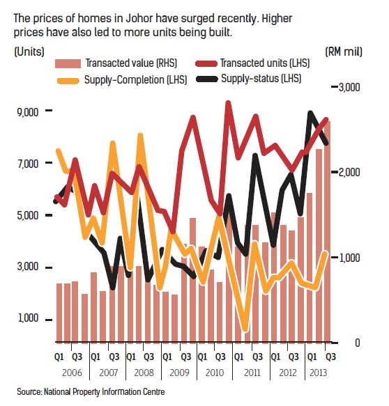 The average residential value for Johor property has risen some 45% over the past five years to RM197,147 in 2012 from RM136,034 in 2009. Comparatively, the country’s average residential value has only gone up by 30% in the same period to RM248,515.