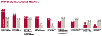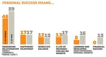 Some intriguing gender differences emerged in our survey data: In defining professional success, women place more value than men do on individual achievement, having passion for their work, receiving respect, and making a difference, but less value on organizational achievement and ongoing learning and development. A lower percentage of women than of men list financial achievement as an aspect of personal or professional success. Rewarding relationships are by far the most common element of personal success for both sexes, but men list merely having a family as an indicator of success, whereas women describe what a good family life looks like to them. Women are also more likely to mention the importance of friends and community as well as family.