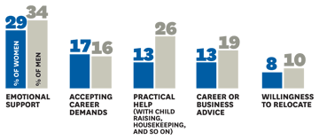 Leaders also emphasized the importance of complementary relationships. Many said how much they value their partners’ emotional intelligence, task focus, big-picture thinking, detail orientation—in short, whatever cognitive or behavioral skills balance out their own tendencies. And many of those we surveyed consider emotional support the biggest contribution their partners have made to their careers. Both men and women often mentioned that their partners believe in them or have urged them to take business risks or pursue job opportunities that were not immediately rewarding but led to longer-term satisfaction. They also look to their partners to be sounding boards and honest critics. One executive said that her partner asks “probing questions to challenge my thinking so I can be better prepared for an opposing viewpoint.”