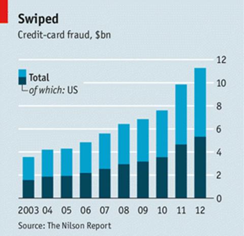 For crooks, there are rich pickings in such data. Total global payment-card fraud losses were $11.3 billion in 2012, up nearly 15% from the prior year. The United States–the only country in which counterfeit-card fraud is consistently growing–accounted for 47% of that amount, according to the Nilson Report: card issuers lost $3.4 billion and merchants another $1.9 billion.