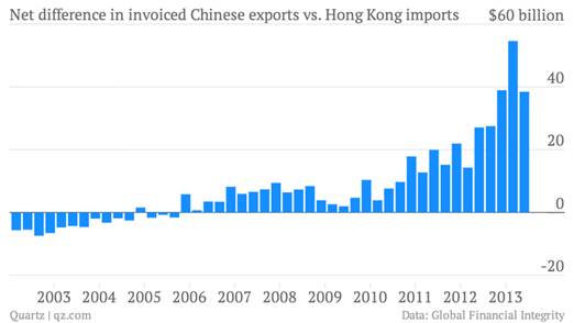 As we pointed out earlier this month, this gap has been growing since 2010. And the nonprofit group Global Financial Integrity estimates that almost $100 billionflowed into China over the first half of 2013 through fake trade invoicing.