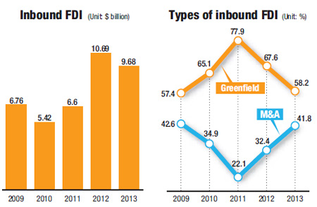 According to the Ministry of Trade, Industry and Energy, FDI reached only $9.68 billion last year, down 9.4 percent from $10.69 billion in 2012.