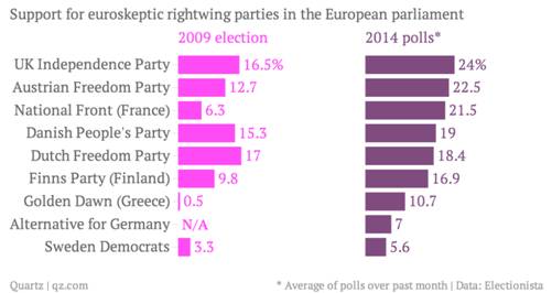 But what’s different this time around is that the rightwing insurgents seem serious about teaming up (pdf), which would give them more clout in the parliament. At the same time, the parliament has acquired more power and prominence, not least the ability for the largest party group to pick the next president of the European Commission, the EU’s influential executive arm.