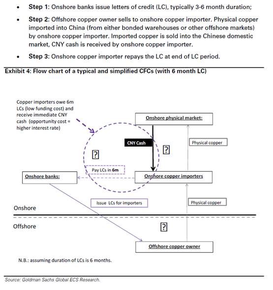 How does all that work? In the simplest terms, investors use offshore-bought copper, kept in tax- and duty-free bonded warehouses, as a collateral for a 180-day letter of credit, a short-term loan, from a bank. They then invest these funds inhigh-yielding wealth management products (WMPs) or other assets, liquidating in time to pay back the LC. Similarly, traders can also use a global copper purchase contract as a way of taking out loans in dollars, which are then changed into yuan to invest in WMPs, taking advantage of the continued strengthening of the yuan against the dollar that many anticipate. Here’s a look at how the trade works when traders well the physical copper on the domestic market, via FT Alphaville:
