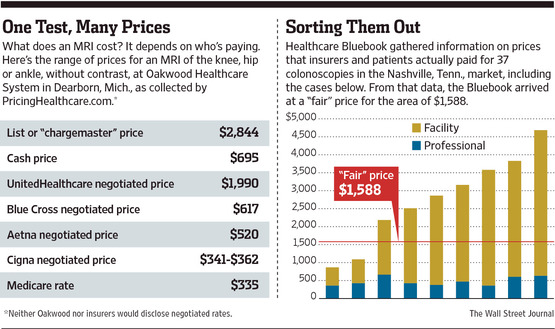 Bluebook’s founder and CEO, Jeffrey Rice, says the rates insurers pay for, say, an MRI or knee surgery can vary as much as chargemaster prices do, particularly if a local hospital is dominant or prestigious.