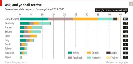 If the state has proved less than trustworthy, private companies are not perfect either. Some have lost large amounts of customers’ data, either by accident or because they have been hacked. The records of more than 100m customers each were stolen from Sony and Target. But Luc Delany, a former Facebook employee who now works as a consultant, points out that companies have a strong incentive to get it right. If people lose trust in a business, the brand will suffer. Companies are walking a fine line, trying to meet the authorities’ requests for information but being open about it (see chart 4). Apple, for one, revealed last year that it had received requests for information from 31 governments. The vast majority came from America’s.
