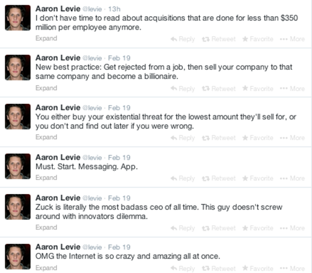 Here’s how Levie reacted on Twitter after he learned of the acquisition: “Must. Start. Messaging. App.”