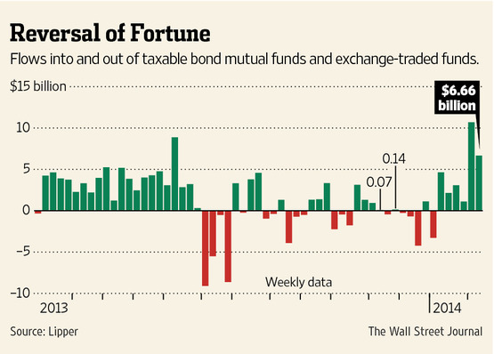 Then, as stocks faltered in the first six weeks of 2014, investors put in over $28 billion more to bond funds than they withdrew.