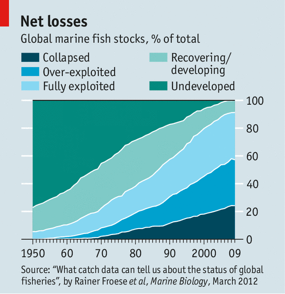 More serious is the global mismanagement of fish stocks. About 3 billion people get a fifth of their protein from fish, making it a more important protein source than beef. But a vicious cycle has developed as fish stocks decline and fishermen race to grab what they can of the remainder. According to the Food and Agriculture Organisation (FAO), a third of fish stocks in the oceans are over-exploited; some estimates say the proportion is more than half (see chart). One study suggested that stocks of big predatory species—such as tuna, swordfish and marlin—may have fallen by as much as 90% since the 1950s. People could be eating much better, were fishing stocks properly managed.