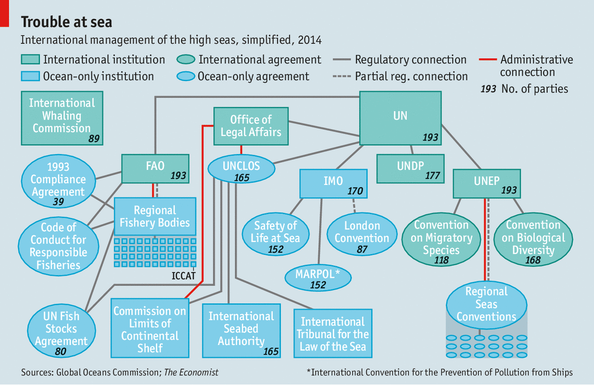Specialised bodies have been set up to oversee a few parts of the treaty, such as the International Seabed Authority, which regulates mining beneath the high seas. But for the most part UNCLOS relies on member countries and existing organisations for monitoring and enforcement. The result is a baffling tangle of overlapping authorities (see diagram) that is described by the Global Ocean Commission, a new high-level lobby group, as a “co-ordinated catastrophe”.